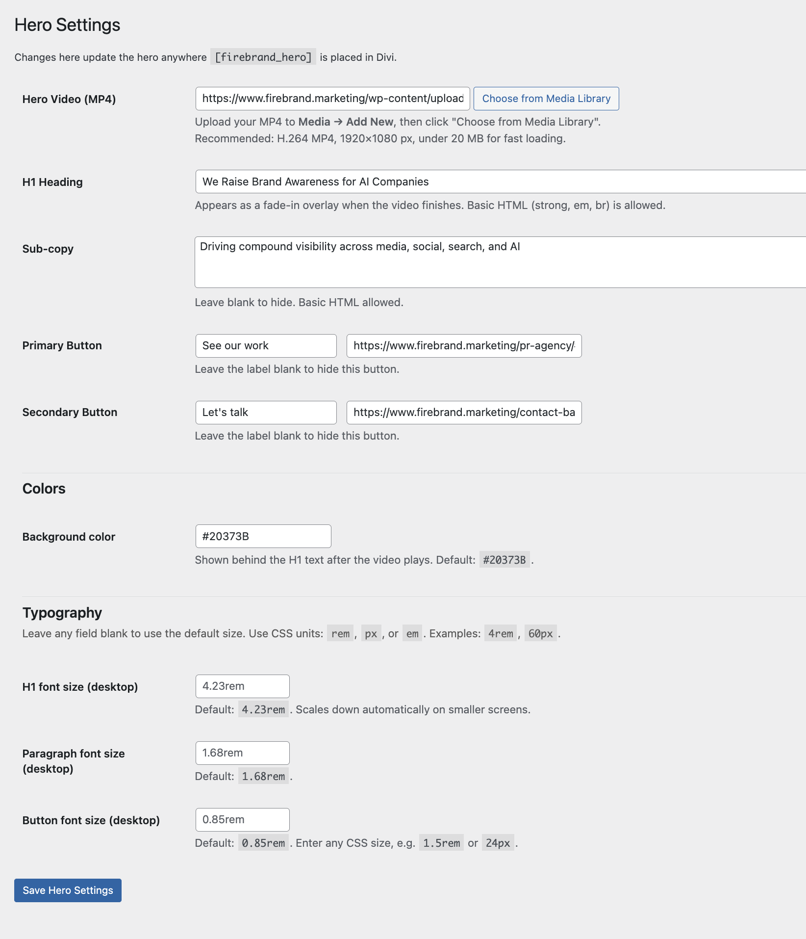 with AI support via Claude and Claude Code.OverviewAs part of owning Firebrand's website end-to-end — design and production — I've been building custom WordPress plugins using Claude Code as part of a broader redesign effort. Rather than wait for a full redesign to ship, I'm moving quickly: building and deploying functional, polished components now while the larger design direction develops in parallel. The two plugins featured here are a configurable logo carousel and a custom video hero.
